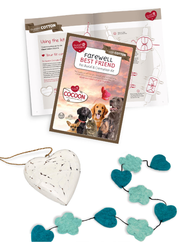 Every Sweet Goodbye COCOON® (Classic Cotton) Soft Pet Casket comes with a ceremony kit that includes everything you need to create a memeorable ceremony that celecrates the life of your dear friend.